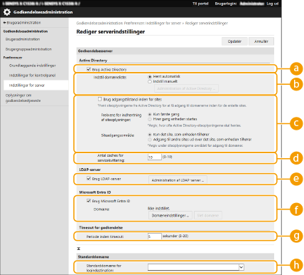 ![]() | For at angive en Active Directory, Microsoft Entra ID- eller LDAP-server som en ekstra godkendelsesenhed skal du registrere oplysninger om den server, der anvendes til godkendelse. Udfør en forbindelsestest efter behov. |