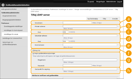 3 | Indtast LDAP-serverinformationerne. ![]() [Servernavn]Indtast navnet til LDAP-serveren. Navnet "localhost" kan ikke anvendes. Servernavnet må ikke indeholde mellemrum. [Primær adresse]Indtast LDAP-serverens IP-adresse eller hostnavn (Eksempel: ldap.example.com). Loopback-adressen (127.0.0.1) kan ikke anvendes. [Port:]Angiv det portnummer, der bruges til kommunikation med LDAP-serveren. Brug den samme indstilling, som er konfigureret på serveren. Hvis du ikke indtaster et nummer, indstilles det automatisk til "636", når afkrydsningsfeltet er valgt for [Brug TLS], og det indstilles til "389", når afkrydsningsfeltet ryddes. [Sekundær adresse:] / [Port:]Ved brug af en sekundær server i dit miljø skal du indtaste IP-adressen og portnummeret. [Kommentarer]Indtast en beskrivelse eller kommentar efter behov. [Brug TLS]Vælg afkrydsningsfeltet, når du bruger TLS-kryptering til kommunikation med LDAP-serveren. [Angiv godkendelsesoplysninger]Ryd afkrydsningsfeltet for at tillade anonym adgang til LDAP-serveren, dog kun hvis LDAP-serveren er indstillet til at tillade anonym adgang. Ved brug af brugernavnet og passwordet til godkendelse skal du vælge afkrydsningsfeltet og indtaste værdier for [Brugernavn:] og [Password:]. ![]() Hvis dette afkrydsningsfelt er markeret, når du vil ændre indstillingerne i [Primær adresse] eller [Sekundær adresse:] for en LDAP-server, skal den adgangskode, der er angivet i [Password:] i [Angiv godkendelsesoplysninger], indtastes. [Startpunkt for søgning:]Angiv placeringen (niveauet) til søgning efter brugerinformationer, når der udføres LDAP-servergodkendelse. |