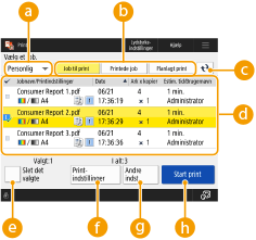 På dette skærmbillede kan du printe holdte dokumenter, sikre printdokumenter eller krypterede, sikre printdokumenter. Du kan tjekke indholdet af disse dokumenter eller planlagte printdokumenter eller ændre printindstillingerne.