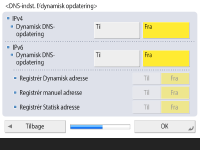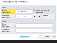 Angiv DNS-serveradressen, DNS-værtsnavnet og DNS-domænenavnet. ![]() ![]() Tryk på <Primær DNS-server> og <Sekundær DNS-server>, indtast IPv4/IPv6-adressen for DNS-serveren, og tryk på <Næste>. For informationer om indstillingerne for DNS-serveradressen kan du se Udførelse af DNS-indstillinger. ![]() ![]() Tryk på <Værtsnavn> for at indtaste navnet på maskinen (værtsnavnet). Tryk på <Domænenavn> for at indtaste det domænenavn, maskinen tilhører, og tryk på <Næste>. Hvis indstillingerne for IPv4 og IPv6 er de samme, skal du trykke på <Til> for <Anv samme Vrtsnavn/Dom.navn som IPv4>. ![]() ![]() For at opdatere automatisk med indstillingerne for Dynamisk opdatering af DNS skal du trykke på <Til> for <Dynamisk DNSopdatering> og trykke på <OK>. Hvis du indstillger <Dynamisk DNSopdatering> for <IPv6> til <Til>, skal du vælge <Til> for de emner, der skal registreres automatisk. | |