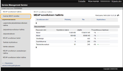 Voit tarkistaa asennettujen sovellusten määrän ja tallennusvälineessä käytetyn tilan. MEAP-sovellusten hallinta