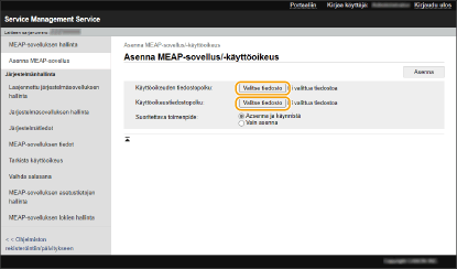 Ennen kuin asennat MEAP-sovelluksen, sinun on hankittava ”lisenssitiedosto” tietokoneella. Kun olet hankkinut lisenssitiedoston, näytä SMS-palvelu Remote UI -etäkäyttöliittymältä asentaaksesi MEAP -sovelluksen.