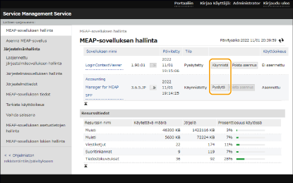 2 | Valitse [Start]/[Stop], jotta voit käyttää MEAP-sovellusta. ![]() ![]() MEAP-sovelluksesta riippuen saatat joutua käynnistämään laitteen uudestaan. Seuraa näytön ohjeita ja käynnistä laite uudestaan. Kun muistille, säikeille, paikoille tai tiedostokuvaajille tarvittavat resurssit ovat kuluneet loppuun, sovellus ei käynnisty, vaikka [Aloita] valitaan. |