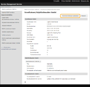 [MEAP Application Information] | Näyttää luettelon sovelluksista (paitsi järjestelmäsovellukset), joita asennetaan paraikaa ja jotka on jo poistettu. |