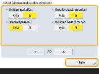 <Unitilan merkkiääni> | Äänimerkki kuuluu, kun laitteeseen kytketään virta tai siitä katkaistaan virta, kun asetat <Pikakäynnistyksen asetukset päävirralle> -asetukseksi <Kyllä>. (Tilanteesta riippuen laite ei ehkä pikakäynnisty, jolloin merkkiääntä ei kuulu.) |
