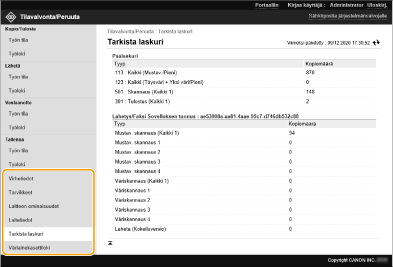 Voit tarkistaa erilaisia tietoja laitteesta, kuten virhetiedot, jäljellä olevan paperin ja väriaineen määrät, tiedot asennetuista lisävarusteista ja tähän mennessä tulostettujen sivujen kokonaismäärän.