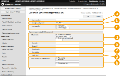 Voit luoda avaimen ja CSR:n laitteessa. Voit myös näyttää CSR-datan näytössä ja viedä sen tiedostona.