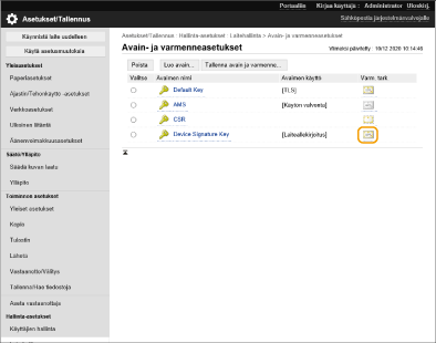 Valitse [Laitehallinta]  [Avain- ja varmenneasetukset].