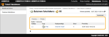 ![]() | Voit käyttää Remote UI (Etäkäyttöliittymä) -sovellusta tulostaessasi, lähettäessäsi tai poistaessasi fakseja ja I-fakseja, jotka on tilapäisesti tallennettu Faksi/I-Faksilokeroon. |