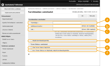 Voit määrittää linkin verkkosivustoon tulostustarvikkeiden ostamista varten. Linkki näytetään, kun tarvikkeiden tiedot tarkistetaan Remote UI (Etäkäyttöliittymä) -sovelluksesta. Verkkosivuston linkin määrittäminen helpottaa tarvikkeiden ostamista käyttäjille.