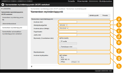 Käynnistä Remote UI (Etäkäyttöliittymä) -sovellus  valitse [Asetukset/Tallennus]  [Laitehallinta]  [Varmennuksen vakuutuspyyntöasetukset (SCEP)]