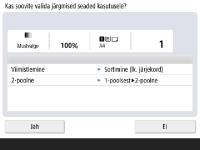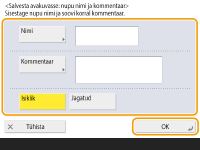 Isikliku nupu salvestamiseks peate olema sisse loginud isikliku autentimishalduse kaudu. Isikliku autentimishalduse seadistuse konfigureerimine Kui valite <Seadme sisselogimise autentimise info> seadele <Faili SA / brausimise autentimiseks kasutatav info>, ei saa faili sihtkoha parooli salvestada isikliku nupuna. <Faili SA / brausimise autentimiseks kasutatav info> Teavet maksimaalse salvestatava isiklike ja jagatud nuppude arvu kohta vaadake teemast Haldusfunktsioonid. Isiklikke nuppe ei saa muuta jagatud nuppudeks ja vastupidi. Selle tegemiseks taastage seaded ja salvestage abil uus nupp.Vajutage pikalt nuppu, mille nime/kommentaari soovite muuta või mida soovite teisaldada/kustutada. Samu toiminguid (nime/kommentaari muutmine või nupu teisaldamine/kustutamine) on võimalik teha nupuga kuval <Avakuva>. Kuva <Avakuva> kohandamineIsiklikke nuppe on võimalik jagada mitme seadme vahel, kui sünkroonite isikustatud andmed. Isikupärastamist võimaldavate üksuste loend Isiklikele/jagatud nuppudele salvestatavad seadedIsiklikele/jagatud nuppudele salvestatavad funktsioonid ja seaded on loetletud allpool. Seaded, mida saab salvestada valikus <Lemmikseaded> seadele <Paljundamine> funktsioonile Paljundamistoimingute vähendamine <Faks> seadme funktsiooniseaded Faksi saatmise põhitoimingud Seaded, mida saab salvestada valikus <Lemmikseaded> seadele <Skaneeri ja saada> funktsioonile Kasulikud skannimisfunktsioonid Seaded, mida saab salvestada valikus <Lemmikseaded> seadele <Skaneeri ja salvesta> funktsioonile Ekraani ja toimingute seadmine salvestamiseks skannimiseks Salvestage funktsioonide <Skaneeri ja salvesta> ja <Juurdepääs failidele> asukohad valikus Salvestusruumi kasutamine Funktsiooni <Faksi/I-faksi postkast> põhifunktsioonide kuva otseteed Juurdepääsu serverisse ja sisselogimise parooli on võimalik salvestada isikliku/jagatud nupuna. See on mugav parooli sisestamise vahelejätmiseks, kui taastate salvestatud nupu. Kui soovite seada parooli registreeritud nupus salvestatud seadetele, sest importide isikliku või jagatud nupu seadeid teisele seadmele ja tahate takistada kasutajatel teise kasutajana esineda, jätke registreerimisel parool ära. Registreeritud nuppude import/eksportRegistreeritud isiklikke/jagatud nuppe saate importida ja eksportida Remote UI (Kaugkasutajaliidese) kaudu. Kõigi seadete importimine/eksportimine Isiklike nuppude/Jagatud nuppude hulgi importimine ei pruugi olla saadaval, olenevalt masina mudelist, kust importida. Lisainformatsiooni saate edasimüüjalt või hooldusesindajalt. |