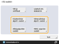 Kui soovite kasutada enda genereeritud võtit ja sertifikaati, peate võtme ja sertifikaadi genereerima enne allkirjeldatud toimingute tegemist. Võrguside võtme ja serdi genereerimine Kui soovite kasutada sertimiskeskuse (CA) loodud võtit ja sertifikaati, peate võtme ja sertifikaadi registreerima enne allkirjeldatud toimingute tegemist. Võtme ja serdi registreerimine Kui määrate funktsiooni <Vormindamise krüpteerimise meetodiks FIPS 140> olekuks <Sees>, saate kasutada USA valitsuse heakskiidetud standardile FIPS (Federal Information Processing Standards) 140 vastavat TLS-sidekrüptimismeetodit. <Vormindamise krüpteerimise meetodiks FIPS 140> Kui TLS-i versiooniks on seatud<TLS 1.0> või <TLS 1.1> ja <Vormindamise krüpteerimise meetodiks FIPS 140> seatakse olekusse <Sees>, siis TLS-i versioon lülitub olekusse <TLS 1.2>. Kui <Vormindamise krüpteerimise meetodiks FIPS 140> on seatud olekusse <Sees> ja TLS-i versiooniks on seatud <TLS 1.0> või <TLS 1.1>, siis lülitub<Vormindamise krüpteerimise meetodiks FIPS 140> olekusse <Väljas>. Kui määrate funktsiooni <Vormindamise krüpteerimise meetodiks FIPS 140> olekuks <Sees>, kui proovite TLS-i jaoks kasutada sertifikaati, mille aluseks on algoritm, mida FIPS pole tunnustanud (tasemest RSA2048bit madalam). Kui määrate funktsiooni <Vormindamise krüpteerimise meetodiks FIPS 140> olekuks <Sees> ja loote side seadmega, mis ei toeta FIPS-i tunnustatud krüptimisalgoritme. Kui <Vormindamise krüpteerimise meetodiks FIPS 140> on seatud olekusse <Sees>, <CHACHA20-POLY1305>, <3DES-CBC>, ja <X25519> olekusse <Väljas>. Kui<CHACHA20-POLY1305>, <3DES-CBC> või <X25519> on seatud olekusse <Sees>, siis lülitub <Vormindamise krüpteerimise meetodiks FIPS 140> olekusse <Väljas>. |
