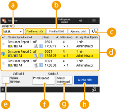 Sellel kuval saate printida ootel dokumente, turvatud prindidokumente või krüptitud turvatud prindidokumente. Saate kontrollida nende dokumentide või ajastatud prindidokumentide sisu või muuta prindiseadistust.