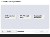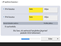 Määrake võrguühenduse seaded. ![]() ![]() Vajutage nuppu <Sees> seade <IPv4 kasutus> või seade <IPv6 kasutus> jaoks ja vajutage nuppu <Edasi>. Võite kasutada ka IPv4 ja IPv6 protokolli korraga. Kui vajutate <Väljas> seade <IPv4 kasutus> ja seade <IPv6 kasutus> jaoks ning vajutate nuppu <OK>, jätke võrguseaded vahele ja jätkake juhisega 9. ![]() Kui vajutage <Sees> seade <IPv4 kasutus> jaoks, määrake järgmised seaded. ![]() IP-aadressi automaatseks hankimiseks vajutage <DHCP> või <Aut. IP> ja vajutage nuppu <Edasi> või <OK>. IP-aadressi käsitsi seadistamiseks tühjendage valik <DHCP> või <Aut. IP>, vajutage <IP-aadress>, <Alamvõrgu mask> ja <Lüüsi aadress> vastava väärtuse sisestamiseks ja vajutage nuppu <Edasi> või <OK>. IPv4-aadressi seadete kohta teabe saamiseks vt teemat „IPv4-aadressi määramine“. ![]() Kui vajutage <Sees> seade <IPv6 kasutus> jaoks, määrake järgmised seaded. ![]() Vajutage nuppu <Sees> olekuta aadressi kasutamiseks või vajutage nuppu <Väljas>, et olekuta aadressi mitte kasutada ja vajutage nuppu <Edasi>. IPv6-aadressi kohta teabe saamiseks vt teemat „IPv6-aadressi määramine“. ![]() Pärast olekuta aadressi määramist määrake järgmised sätted. ![]() Vajutage nuppu <Sees> käsitsi määratud aadressi kasutamiseks või vajutage nuppu <Väljas>, et käsitsi määratud aadressi mitte kasutada ja vajutage nuppu <Edasi>. Käsitsi määratud aadressi kasutamiseks vajutage <Käsitsi seat. aadress>, <Prefiksi pikkus> ja <Marsruuteri vaikeaadress> ja sisestage vastav väärtus. ![]() Pärast käsitsi määratud aadressi määramist määrake järgmised sätted. ![]() Vajutage nuppu <Sees>, et kasutada DHCPv6-protokolli või vajutage nuppu <Väljas>, et mitte kasutada DHCPv6-protokolli, seejärel vajutage nuppu <OK>. | |