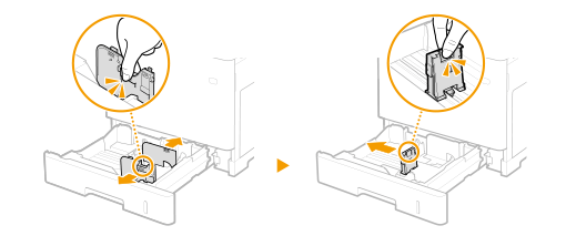 Удерживая нажатым рычаг разблокировки, переместите направляющую для бумаги, чтобы совместить выступ с меткой соответствующего формата бумаги.