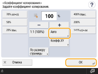 Если при копировании коэффициент масштабирования копии совпадает с форматом исходного оригинала, небольшая часть изображения у краев копируемого изображения может отсутствовать. Чтобы избежать этого, уменьшите размер изображения. Для этого последовательно нажмите <Коэфф. копирования> <По размеру страницы>, чтобы отобразились отсутствующие края изображения.Если выбран вариант <По размеру страницы>, для параметра <Сдвиг> автоматически устанавливается значение <По центру>. Оригиналы с высокой прозрачностью, например OHP-пленки, нельзя сканировать, используя для этого настройку Авто для параметра Коэффициент копирования. Вместо этого используйте режим Фиксированное масштабирование или Масштабирование в процентах. Если задан режим <Авто>, формат бумаги необходимо выбрать вручную. Если не выбрать формат бумаги, коэффициент копирования автоматически устанавливается в соответствии с форматом бумаги, загруженной в кассету для бумаги 1. |