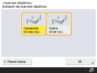 В зависимости от типа бумаги функции конечной обработки могу быть недоступны. Технические характеристики аппаратного обеспечения При помещении оригинала на стекле экспонированияЧтобы воспользоваться функцией сортировки и группировки копий оригинала, помещенного на стекло экспонирования, на экране основных функций копирования нажмите <Параметры> <Составление задания>.Во время копирования с группированием копий между каждой страницей следует вставить разделитель заданийЕсли выбран вариант <Группа (те же страницы)>, между каждой группой копий можно вставить разделитель заданий. Дополнительные сведения см. в разделе <Разделитель заданий между группами>. <Разделитель заданий между группами> При настройке параметров в <Доступ к сохр. файлам>Функции окончательной обработки можно использовать только при печати PDF- или XPS-файлов. |