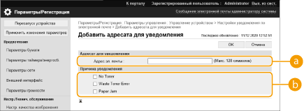 Нажмите [Управление устройством] [Настройки уведомления по электронной почте]  [Добавить адресата для уведомления].