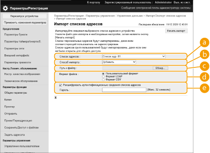 3 | Настройте необходимые параметры. ![]() [Списки адресов]Выберите список адресов, в который следует импортировать адресатов. [Способ импорта]Выберите [Добавить], если требуется добавить импортированных адресатов с сохранением текущего списка адресов, или [Удалить и перезаписать], чтобы удалить текущий список адресов и перезаписать данные импортированными адресатами. [Путь к файлу]Нажмите кнопку [Выбор файла] и укажите файл для импорта. [Формат файла]Выберите формат файла с данными для импорта. Выберите [Пользовательский формат] для файлов в специальном формате для многофункциональных аппаратов Canon (*.abk), выберите [Формат LDAP] для файлов в формате LDAP (*.ldif) или [Формат CSV] для файлов в формате CSV (*.csv). [Расшифровать аутентификационные сведения списков адресов]При импорте зашифрованных файлов установите этот флажок и введите пароль, который был указан при экспорте параметров. |