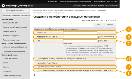 Можно указать ссылку на веб-сайт для приобретения расходных материалов, которая будет отображаться при проверке информации о расходных материалах через Remote UI (Удаленный ИП). Указанная ссылка на веб-сайт облегчает пользователям процесс приобретения расходных материалов.