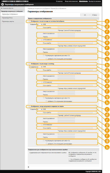 Укажите настройки прокси-сервера в функции Визуальное сообщение для соответствия настройкам в <Параметры Proxy>. Если установлен прокси-сервер, указанное содержимое может не отображаться. В этом случае установите адрес исключения, чтобы прокси-сервер не использовался.