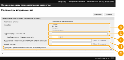 Если служба для синхронизации пользовательских параметров запущена на аппарате-сервере (если аппарат является сервер-клиентским аппаратом, параметр можно изменить путем одновременного запуска службы сервера и службы клиента).