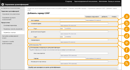 Укажите ограничение времени для попытки подключения к серверу аутентификации и ограничение времени ожидания ответа. Если включен параметр [Хранить аутентификационные сведения для зарегистрированных пользователей] и вы не можете войти в систему в течение указанного здесь времени, выполняется попытка входа в систему с использованием аутентификационных сведений, сохраненных в кэше.