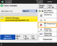 Если выбран формат файла <OOXML>, отправка возможна только с параметрами <Авто (Цветн./Шкала серого)>, <Полноцветный> или <Шкала серого>.