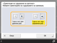 <Настр. на всеки цвят>, можете да регулирате плътността на фона според цвета.![]() | Можете да зададете ориентацията на оригинала, поставен върху стъклото за документи или в подаващото устройство, като хоризонтална или вертикална. |