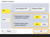 Ако се избере <Изкл.>, трябва да се въведе код на отдел при извършване на съответната задача.