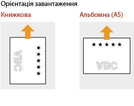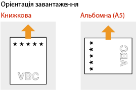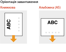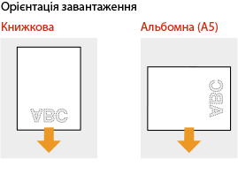 Під час виконання копіювання також звертайте увагу на орієнтацію оригінального документа.Помістіть оригінал у подавач стороною для копіювання догори або помістіть його на скло експонування стороною для копіювання донизу, як показано на ілюстраціях нижче.
