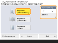 <Видалення рамки>.1 | Натисніть <Видалення рамки оригіналу> і перевірте <Формат оригіналу>. ![]() Якщо формат, який відображається для параметра <Формат оригіналу>, відрізняється від формату оригіналу, натисніть <Змінити>, щоб вибрати формат. Режим видалення рамки оригіналу можна застосувати лише до форматів оригіналів, які відображаються на сенсорному дисплеї. |