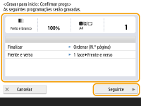 Se selecionar <Ligado> para <Começar operação para chamada (a operação começa quando se carrega no botão).>, a cópia começa quando carregar no botão gravado sem carregar em  (Iniciar). Selecione <Desligado> se pretender começar a copiar manualmente ao carregar em  (Iniciar).