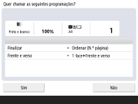 Se selecionar <Ligado> tanto para <Mostrar ecrã de confirmação ao chamar> como para <Começar operação para chamada (a operação começa quando se carrega no botão).>, a operação de cópia começa depois de selecionar <Sim> no ecrã de confirmação.