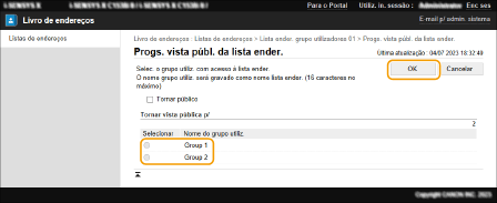 Também pode gerir Listas de Endereços de Grupos de utilizadores permitindo que apenas utilizadores com privilégios de Administrador gravem/editem destinos a partir da Remote UI (Interface Remota). <Usar lista end. grupo utiliz.>