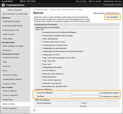 Introduza a password em [Password codificação] selecione o nível de segurança em [Nível de segurança]  clique em [Inic. exportação]  [OK].