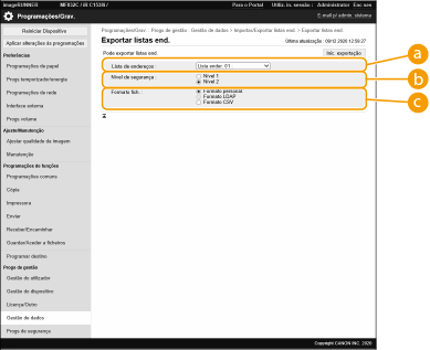 Só pode importar/exportar as listas de endereços do Livro de endereços. É necessário ter privilégios de administrador para realizar estas operações.