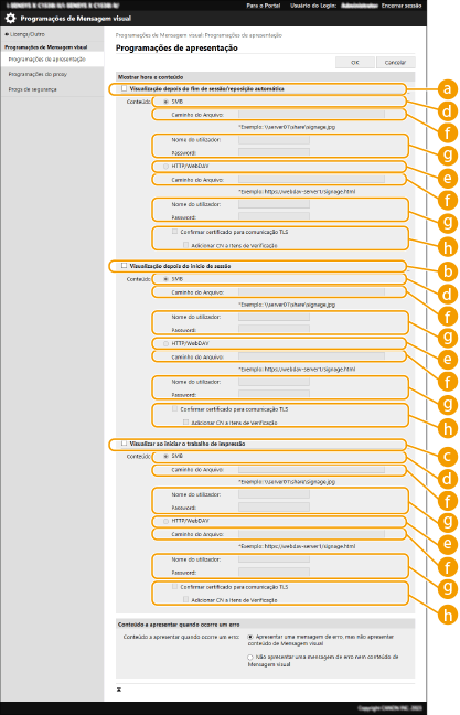 A configuração para apresentar o conteúdo depois de terminar sessão está ativada quando <Progs visualização do ecrã de início de sessão> estiver configurada para <Mostrar quando a máquina começar a funcionar>. Para apresentar os conteúdos após o início do modo de reposição automática, configure <Hora da reposição automática> para um minuto ou mais.