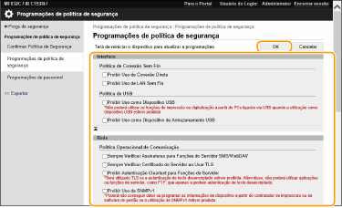 Se não tiver sido configurada nenhuma palavra-passe (Utilizar uma palavra-passe para proteger as programações da política de segurança), leia o conteúdo e clique em [OK] para passar ao passo 6.