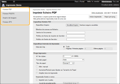 Utilizando a Remote UI (Interface Remota), é possível imprimir os ficheiros gravados num computador ou numa rede diretamente a partir da máquina sem utilizar o controlador da impressora. Não precisa de abrir os ficheiros no computador para a impressão.