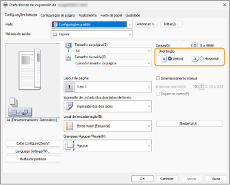 Selecione a orientação do original no ecrã de programações de impressão da aplicação.