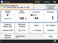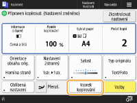 Zde se zobrazuje stav nastavení, např. poměr kopírování, velikost papíru a počet kopií. V zájmu správného okopírování dokumentů nastavení vždy zkontrolujte. Chcete-li některé nastavení změnit, vyberte požadovanou položku nastavení.