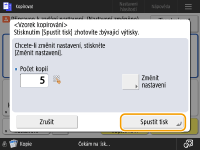 Stisknutím <Spustit tisk> spusťte tisk zadaného počtu kopií. Jestliže jste v kroku 5 vybrali <Všechny strany>, vytiskne se počet kopií bez jedné kopie. Jestliže jste v kroku 5 vybrali <Zadané strany>, vytiskne se celý počet kopií.