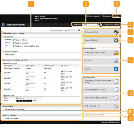 Pokud současně používá toto Remote UI (Vzdálené UR) více uživatelů nebo pokud je ovládací panel stroje provozován současně s Remote UI (Vzdálené UR), bude poslení provedená operace neúčinná.