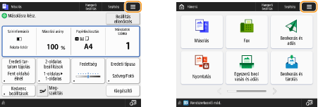 A <Főmenü> képernyőn az Alapképernyő megjelenítéséhez nyomja meg a funkciógombokat, ahol olyan alapfunkciókat érhet el, mint a másolás, faxolás és a beolvasás. Bár az Alapképernyőn a kijelző és a beállítási elemek a funkcióktól függően változnak, igényeinek megfelelően módosíthatja a beállításokat. Alapképernyők személyre szabása
