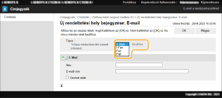 A megjelenő elemek a rendeltetési hely típusától függően eltérők. A bejegyzendő információkkal kapcsolatos további tudnivalókat lásd: Rendeltetési helyek felvétele a címjegyzékbe.