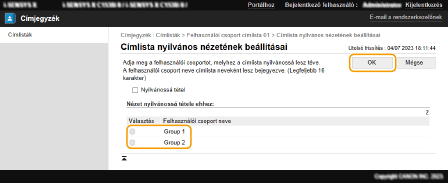 [Személyes címlista/Felhasználói csoport címlista beállításai] gombot, és jelölje be az [Felhasználói csoport neve módosításának alkalmazása a Felhasználói csoport címlista nevére] jelölőnégyzetet. Az [Felhasználói csoport neve módosításának alkalmazása a Felhasználói csoport címlista nevére] lehetőség csak akkor áll rendelkezésre, ha a személyes hitelesítéskezelés engedélyezve van.