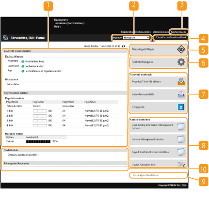 Ebben a részben a rendszergazda üzenetei és a készülék támogatásával kapcsolatos hivatkozások jelennek meg. A rendszergazda üzeneteinek megjelenítése