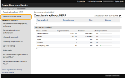 Możesz sprawdzić liczbę zainstalowanych aplikacji i wykorzystane miejsce na nośniku pamięci. Zarządzanie aplikacjami MEAP